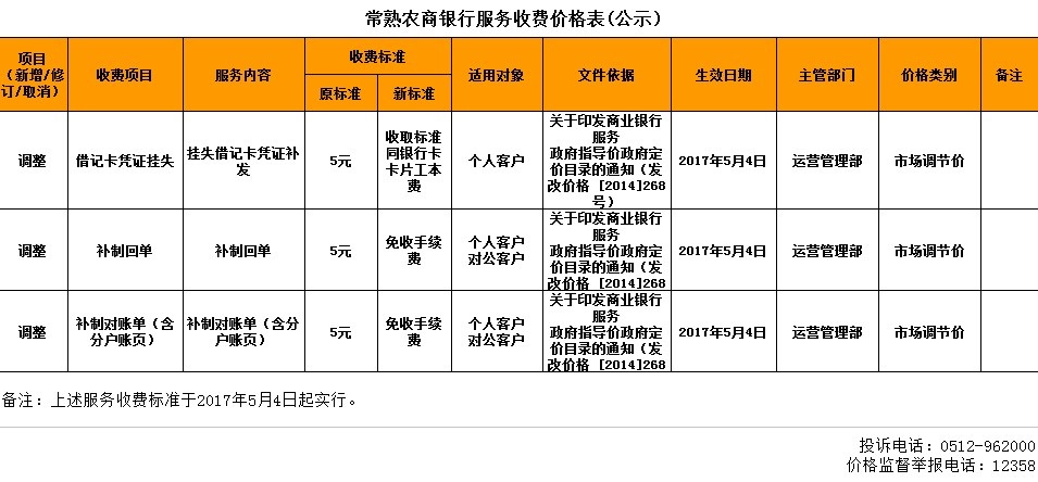 常熟农商银行服务收费价格表